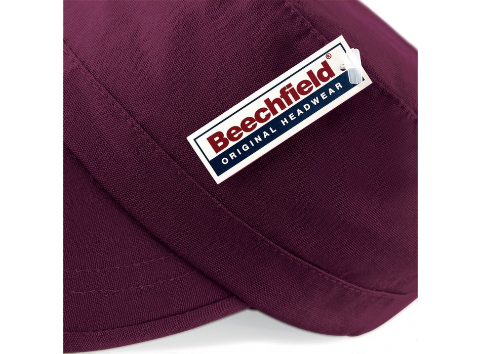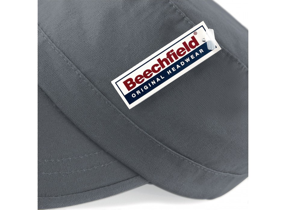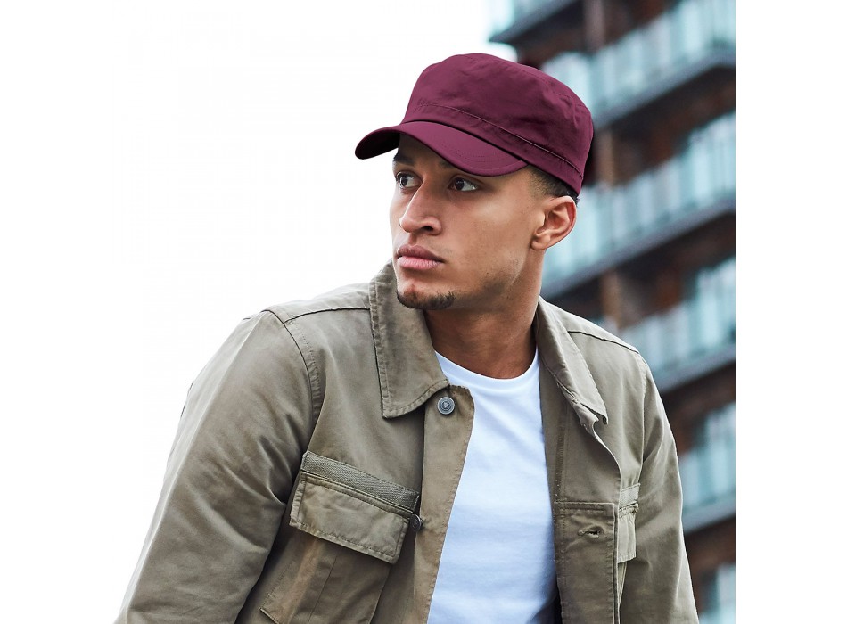 Il Cap in stile militare, realizzato in cotone resistente, presenta 4 asole in metallo sui lati e una fascetta tergisudore imbottita. Include una chiusura in velcro e la possibilità di personalizzazione. Coordinato disponibile per bimbo, art. MB7018.