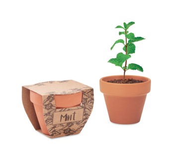 Questo set di tre vasi in terracotta, contenenti semi di menta, prezzemolo e basilico, è un prodotto...