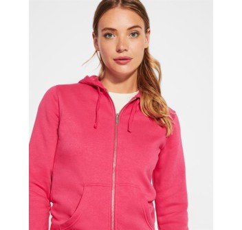 Questa felpa da donna con cappuccio rivestito in tinta è un capo di abbigliamento versatile. La cerniera...