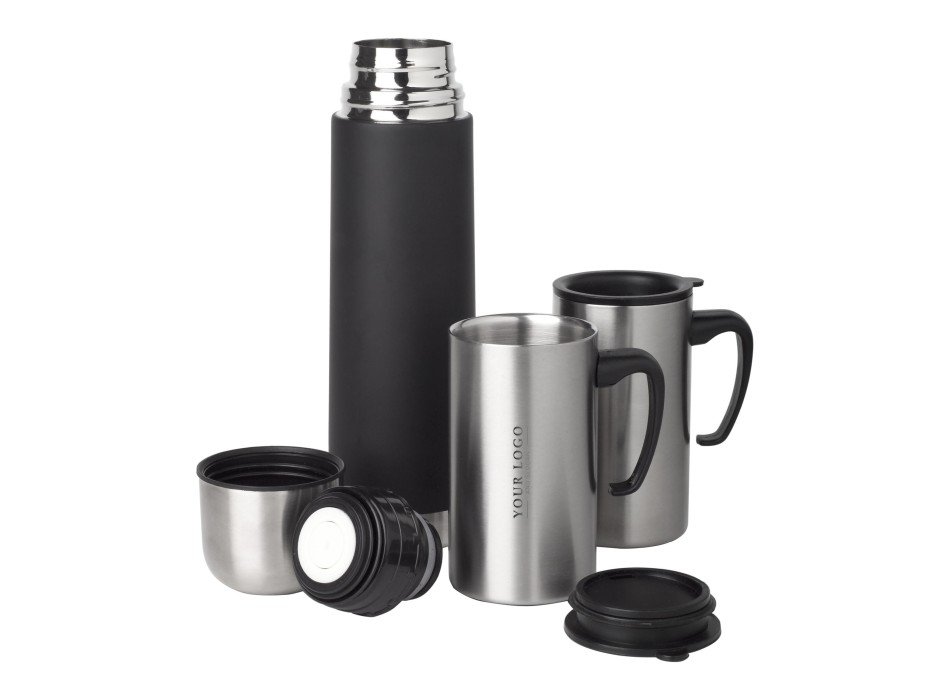 Il set thermos in acciaio inox è un prodotto dotato di una capacità di 500 ml e di due tazze da 250 ml, perfetto per condividere una bevanda calda con un amico o un collega. La custodia in poliestere 600 D protegge il thermos da eventuali urti o graffi, rendendolo ideale per le attività all'aperto. La finitura in acciaio inox conferisce al prodotto un aspetto elegante e moderno, adatto a chi cerca un oggetto di design. Personalizzabile con il logo dell'azienda, questo set thermos rappresenta un'ottima scelta per promuovere il brand in modo originale e funzionale.