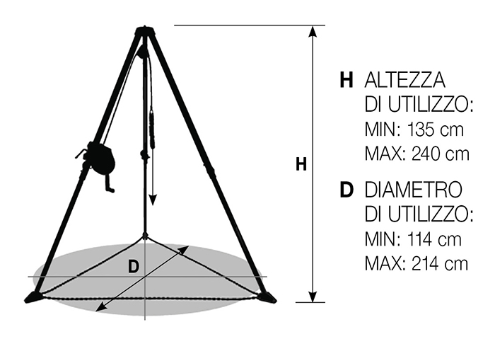 TRIPODE DI SALVATAGGIO, art. TRIPODE, DISPOSITIVO MOBILE PROGETTATO PER L'ACCESSO DELLE PERSONE A SPAZI ANGUSTI., La struttura è composta da tre gambe telescopiche, regolabili, in alluminio anodizzato., La base del tripode può essere montata e smontata in, modo agevole e veloce senza l'aiuto di utensili., è compreso un verricello di salvataggio., Cavo in acciaio zincato di 4,8 mm., I punti di ancoraggio del dispositivo sono stati testati in modo soddisfacente con un carico di 150, kg., Distanza massima di sollevamento: 20 metri, Sistema di blocco manuale, Peso complessivo del dispositivo: 33 kg, ALTEZZA DI UTILIZZO:, MIN: 135 cm / MAX: 240 cm, DIAMETRO DI UTILIZZO:, MIN: 114 cm / MAX: 214 cm, DPI 3ª categoria, TRIPODE: EN 795 Classe B, RECUPERATORE: EN 1496 Classe A, DURATA UTILE TEORICA DEL DISPOSITIVO:, 15 anni dalla data di produzione